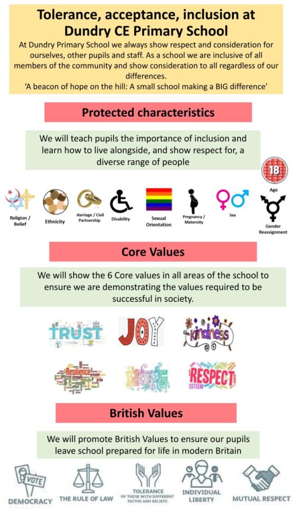 We teach through our curriculum and beyond to ensure our children understand British Values, protected characteristics and how these link to Dundry’s Core Values and relate to us all.